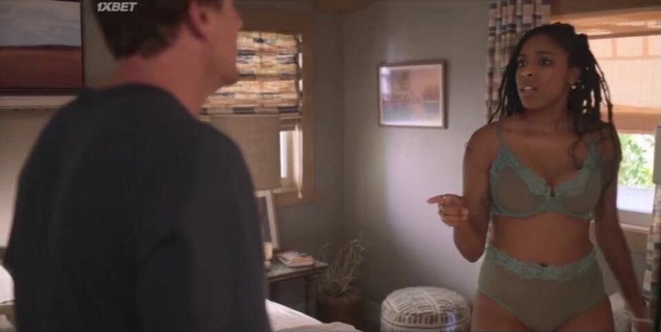 Jessica Williams without a bra in a scene from the series Shrinking