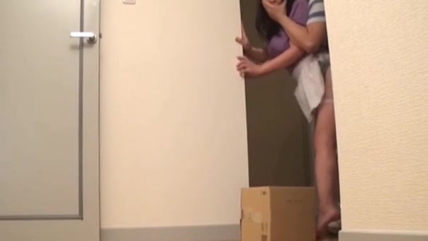 A neat and busty wife with black hair is attacked by a courier man at the entrance ...